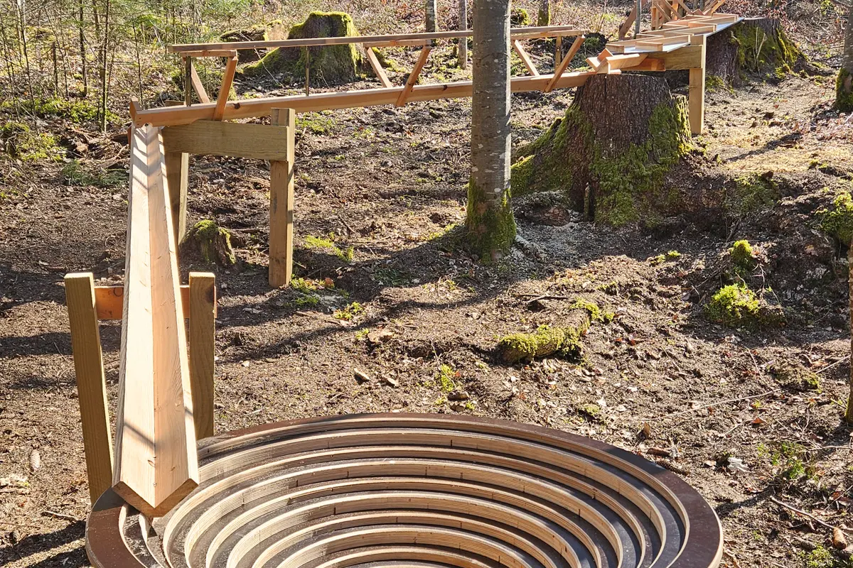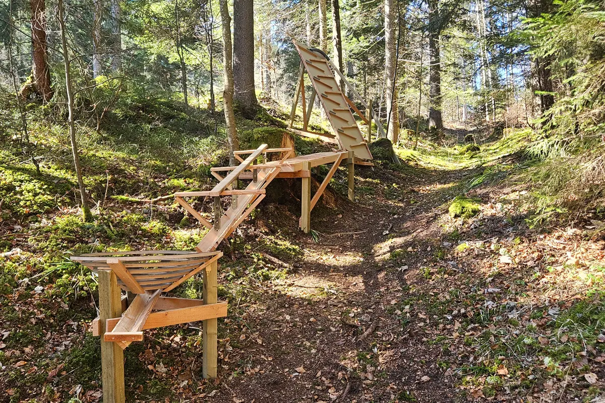 Jeux en bois intégrés au paysage, sans plastique ni couleurs criardes