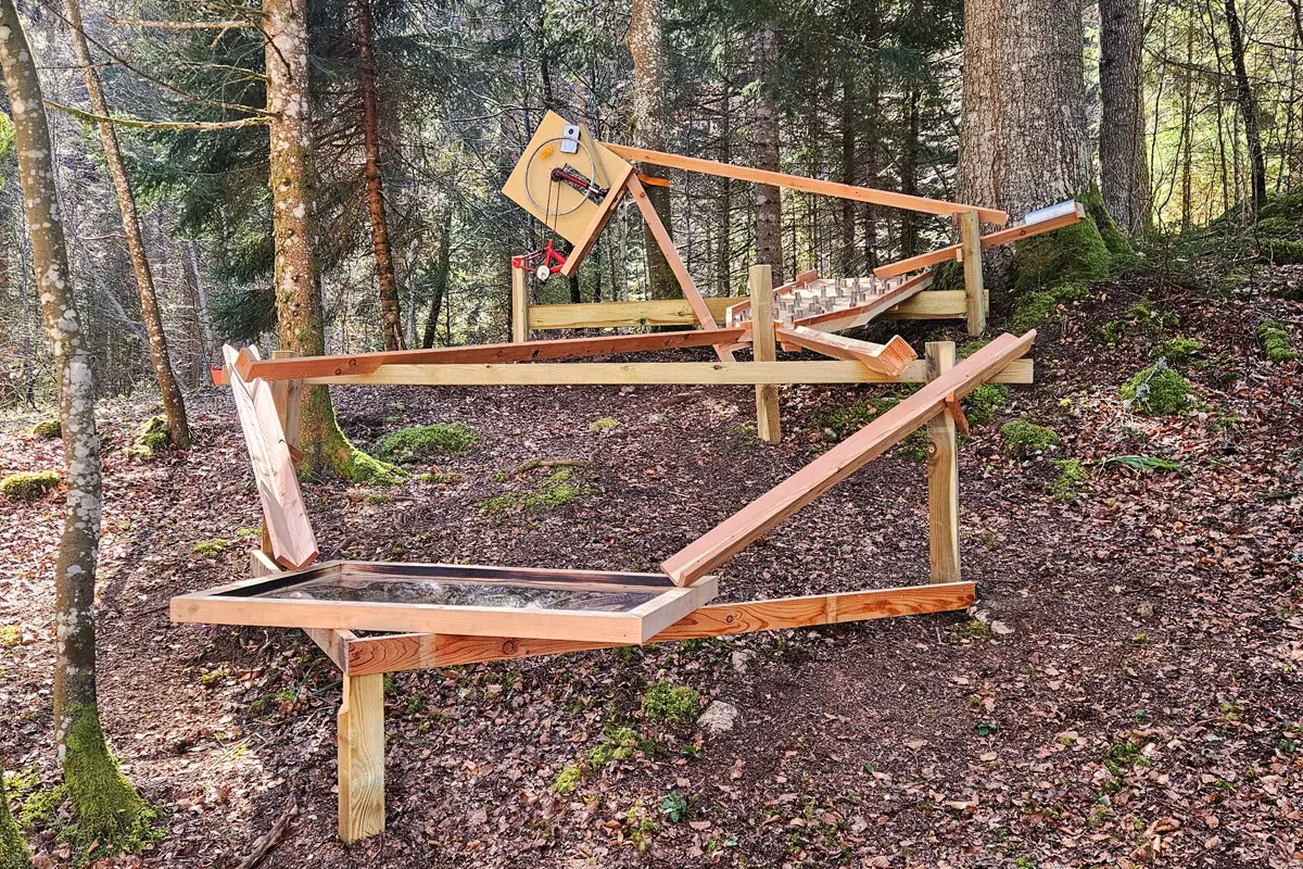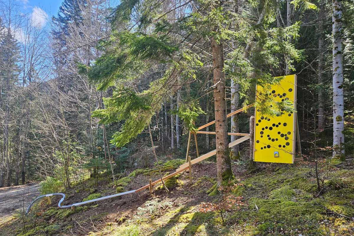 Munis de votre balle (à obtenir à la caisse des installations), partez sur un parcours de randonnée facile et découvrez 5 stations ludiques en bois, conçues et fabriquées dans la région par la Menuiserie Thiébaud, avec du bois local.